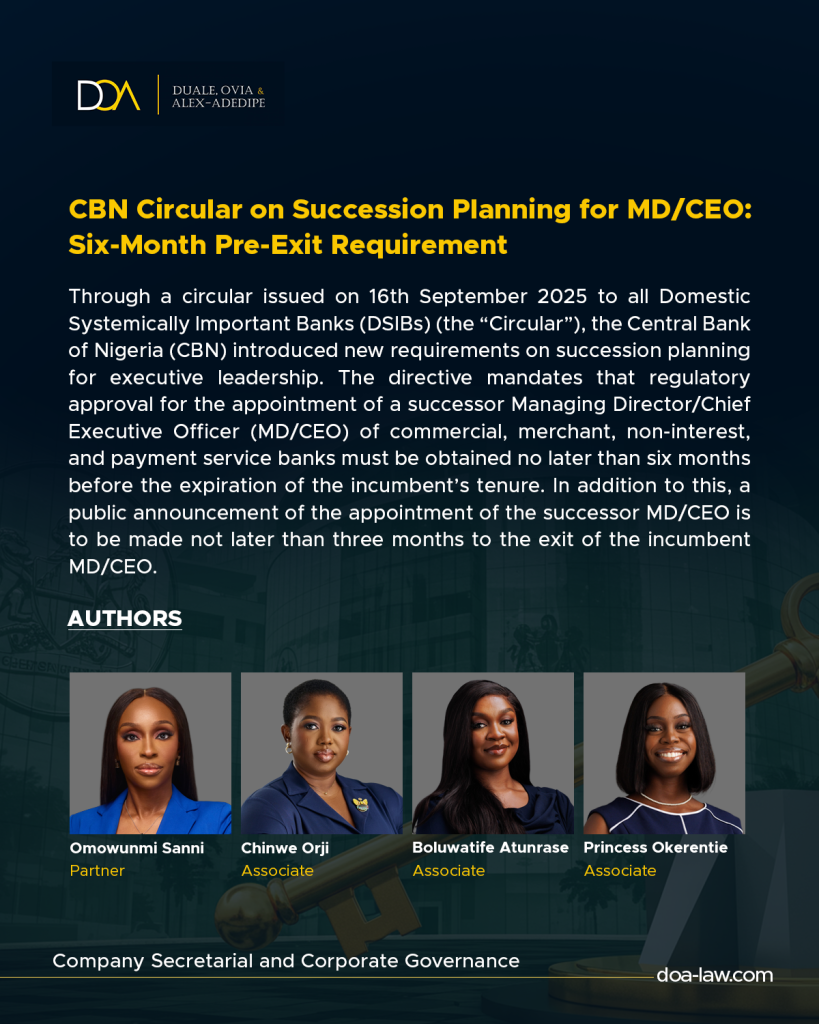 Through a circular issued on 16th September 2025 to all Domestic Systemically Important Banks (DSIBs) (the “Circular”), the Central Bank of Nigeria (CBN) introduced new requirements on succession planning for executive leadership. The directive mandates that regulatory approval for the…